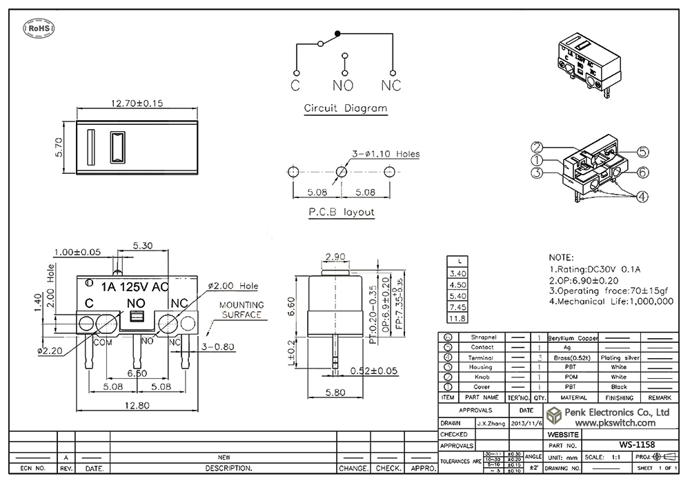 规格参数 1.额定值 : DC30V 0.1A 2.接触电阻:≤100mΩ 3.绝缘阻抗: ≥100mΩ DC500V 4.使用温度范围: -25℃+85℃ 5.环境湿度: ≤85%RH 6.机械寿命:1000000Cycles 7.操作力度:70±15gf 8.动作位置:6.90±0.2mm
